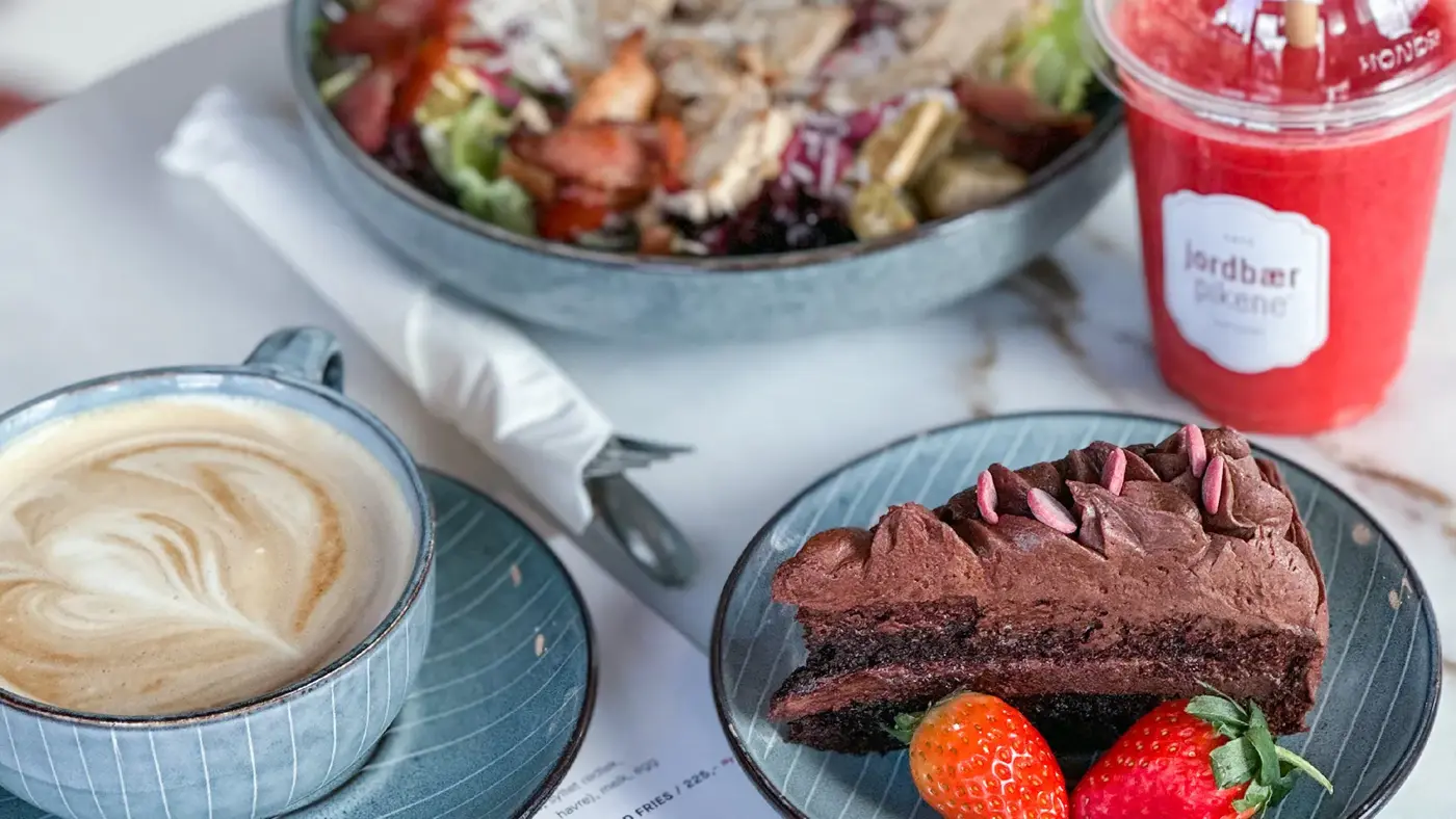 Vi lager både mat og kaker fra bunnen av, med sesongens friske råvarer. Dermed er vi et naturlig møtested for alt fra kaffe og kaker til lunsj og middag. Maten serverer vi med et stolt smil om munnen, og, vi er så fornøyd med oppskriftene våre at vi gjerne deler dem med deg.