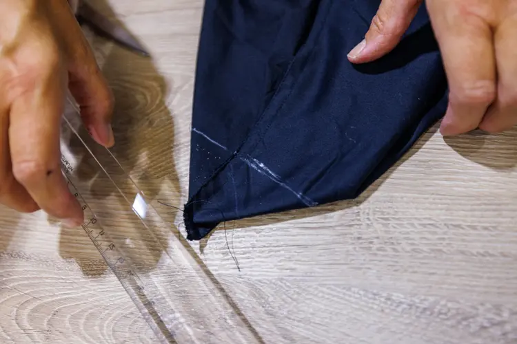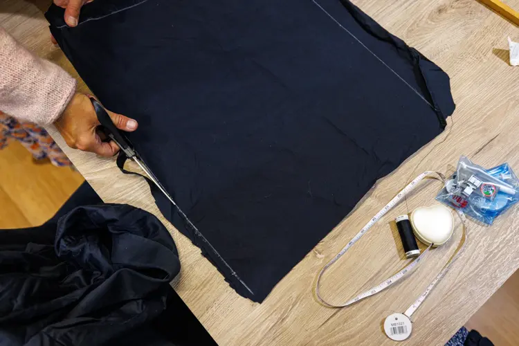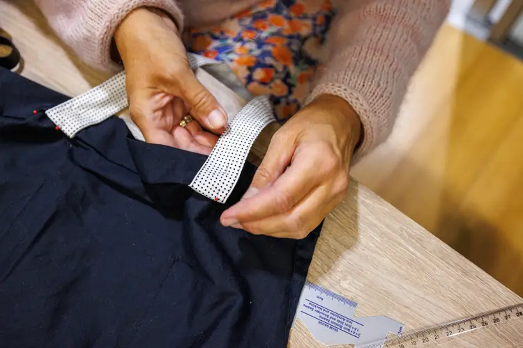 - Brett ned siden som ikke er sydd igjen 4 cm inn to ganger. Fest med knappenåler.