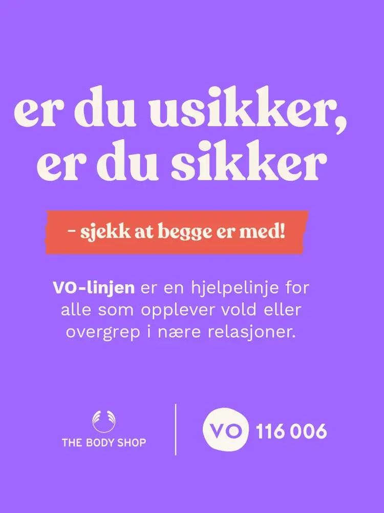 Samtidig som den samme forskningen viser at kun 1 av 10 oppsøker medisinsk hjelp i den første perioden etter voldtekten. Med kampanjen «Er du usikker, er du sikker - sjekk at begge er med» ønsker The Body Shop og Vold- og overgrepslinjen å sette fokus på tematikken, og samtidig informere om at det finnes hjelp.