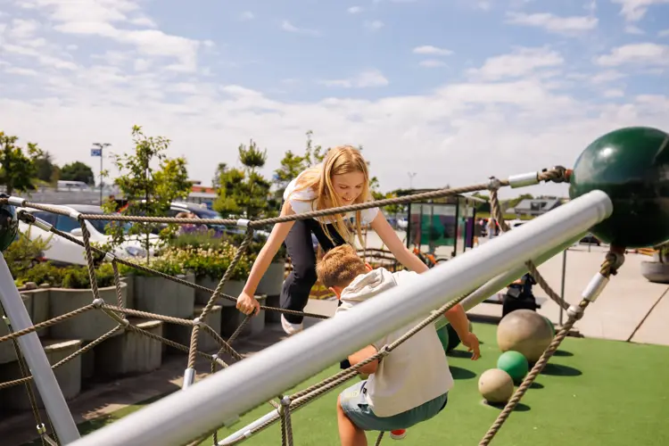 Mange familier liker seg i foodcourten. Flere av spisestedene tilbyr også uteservering. Du kan ta med deg barnevogn på alle kaféer og restauranter.